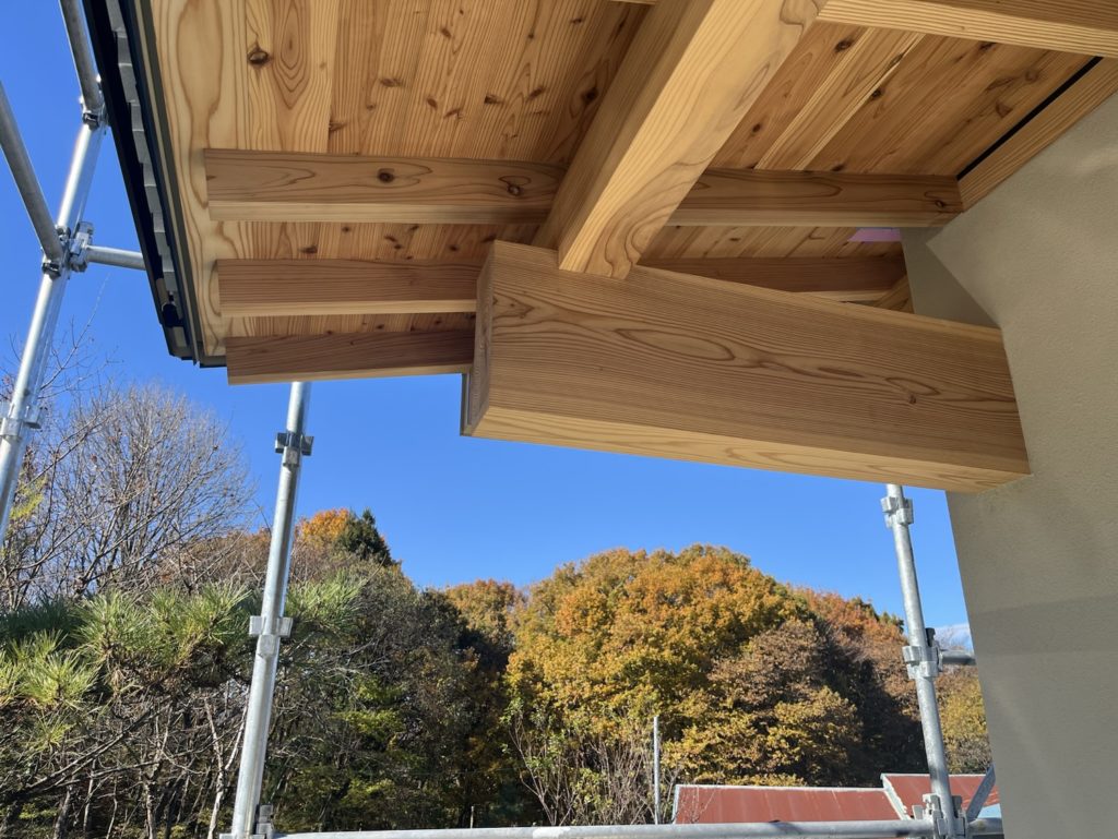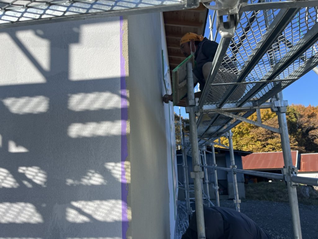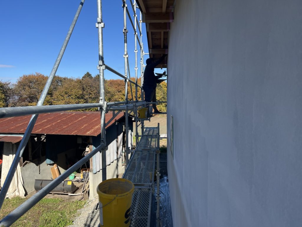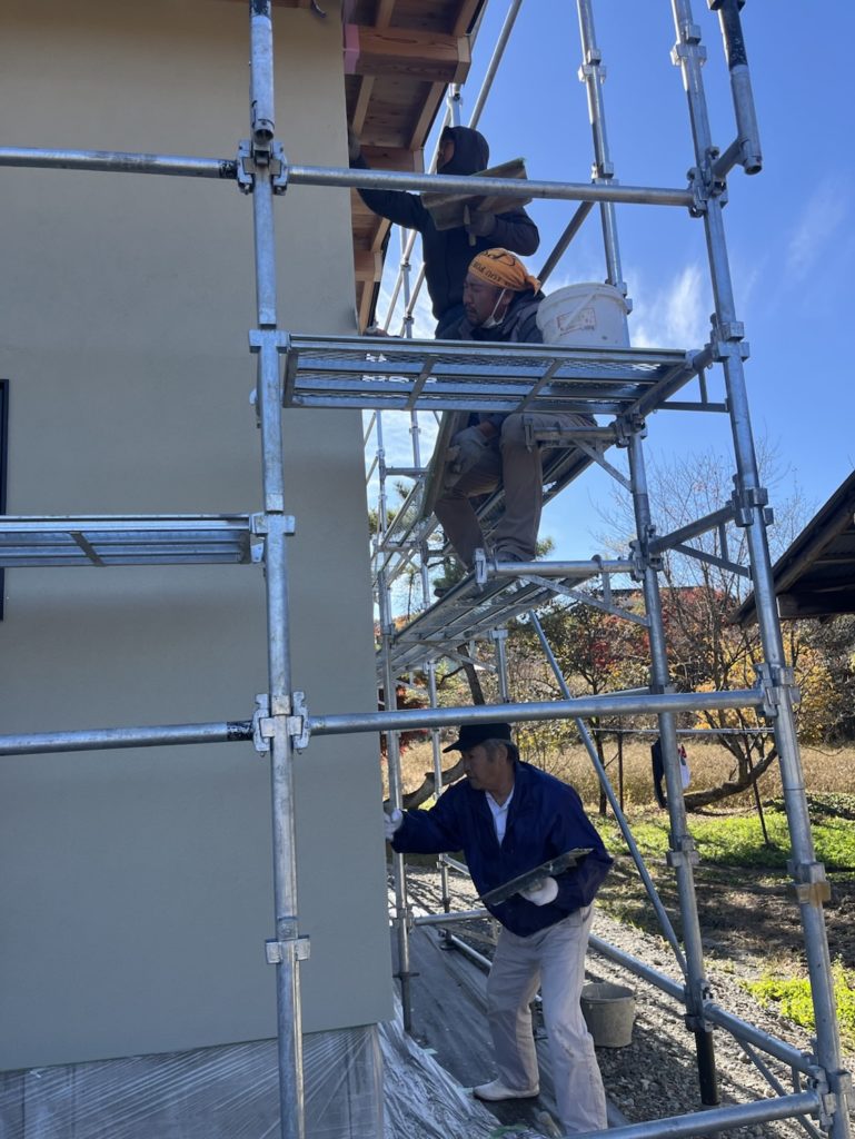 高崎市倉渕町の新築工事では、松井左官さんが外壁の上塗り施工をしてくださっています。僕は作業場で加工業務を行なっていましたので、朝2番くらいのタイミングで現場に行くことができました。